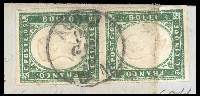 1857 - 5 cent. verde scuro (13Ac), coppia ben marginata, un esemplare piegato apposto "a cavallo", l'altro perfetto, su lettera diretta a militare da Acqui 14/6/1857 a Venaria Reale. Si conoscono pochissime lettere dirette a militari con coppia del 5 cent. in periodo non belligerante. Si tratta dell'unica coppia isolata nota su documento viaggiato di questa rarissima tinta, non menzionata dai cataloghi. Rarità della IV emissione di Sardegna. Ferrario, dettagliato cert. Colla (stima cat. ca. € 150.000).