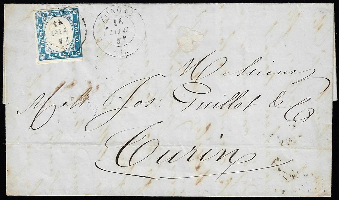 1857 - 20 cent. (15), francobollo tendente al celeste nella metà superiore sinistra e al cobalto nella metà inferiore a destra, su lettera da Zoagli 16/12/1857 (punti 7) a Torino. Curiosa!