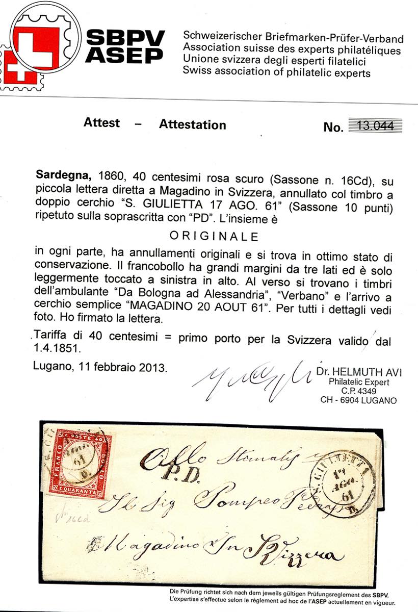 1861 - 40 cent. rosa scuro (16Cd), sfiorato in alto a sinistra, su fresca lettera da San Giulietta 17/8/1861 (punti 10), a Magadino, ... Leggi tutto