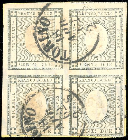 1861 - 2 cent. grigio verdastro per stampati (20b), blocco di quattro, intaccato in basso, usato a Torino 18/4/1862 su piccolo frammento.