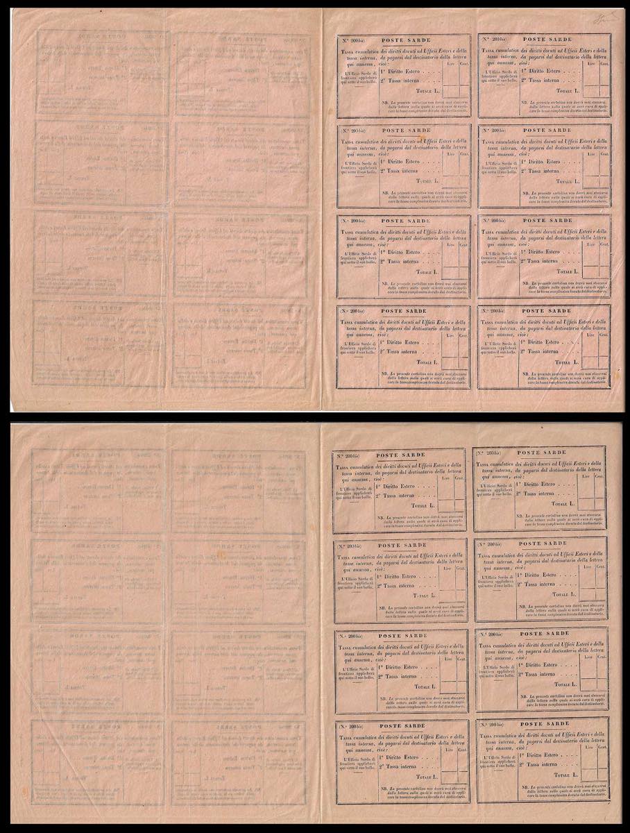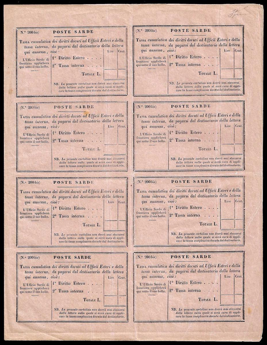 SEGNATASSE 1859 - Modello 200 bis, dicitura "NB" in basso su tre righe, foglio doppio di 16 esemplari, comprendente alle posizioni 7 e 15 la varietà "dicitura più stretta" (4,4a), nuovo, senza gomma come sempre, perfetto. Raro. Ferrario.