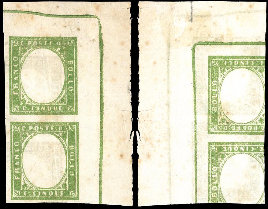 1863 - 5 cent. verde, prova di stampa con stampa recto-verso, coppia verticale, angolo integrale di foglio mostrante la linea di riquadro, ... Leggi tutto
