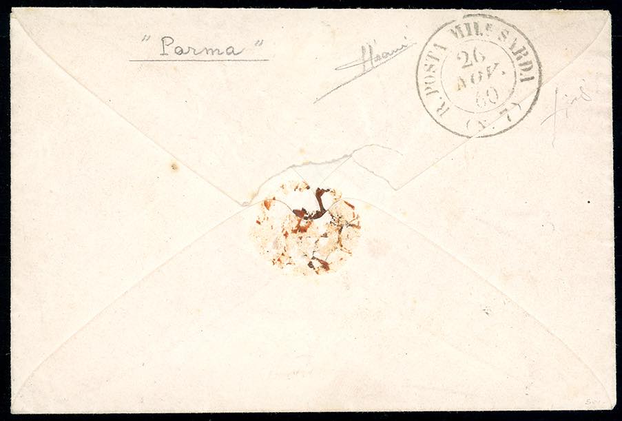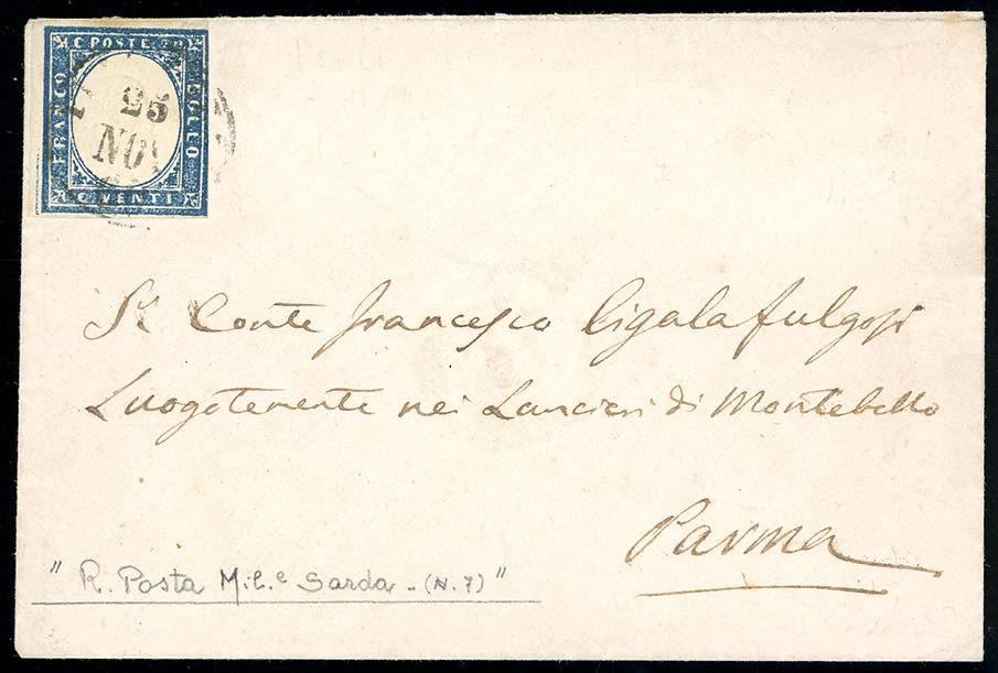 1860 - 20 cent. IV emissione di Sardegna (15C), su busta da Piacenza 25/11/1860 a Parma, indirizzata ad un Luogotenente dei Lancieri di Montebello, al verso il bollo della R.Posta Militare Sarda n. 7. Interessante e non comune. Sorani, Fiecchi.