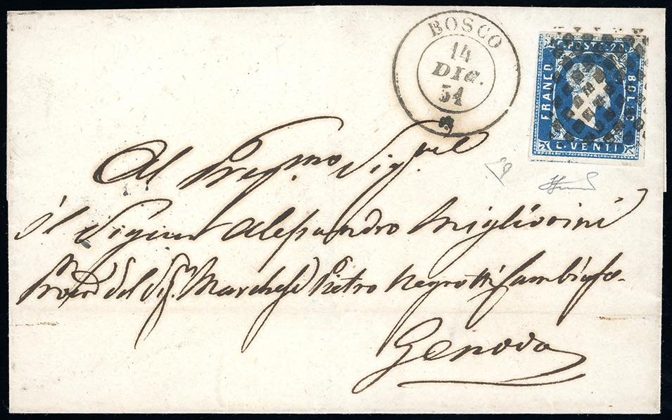 PIEMONTE-BOSCO rombi, d.c. rosetta punti 7 - 20 cent. azzurro (2), perfetto, su fresca lettera del 14/12/1851 a Genova, bollo d'arrivo. Ferrario, E.Diena.