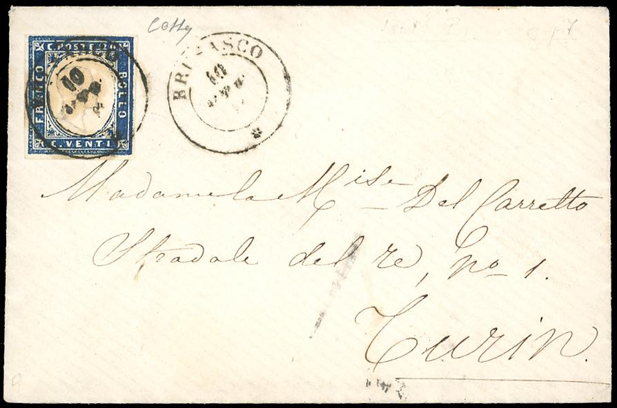 PIEMONTE-BRUSASCO, punti 9 - 20 cent. cobalto verdastro scuro (15Df), perfetto, su busta del 10/10/1861 per Torino. Molto rara.Cert. Colla.