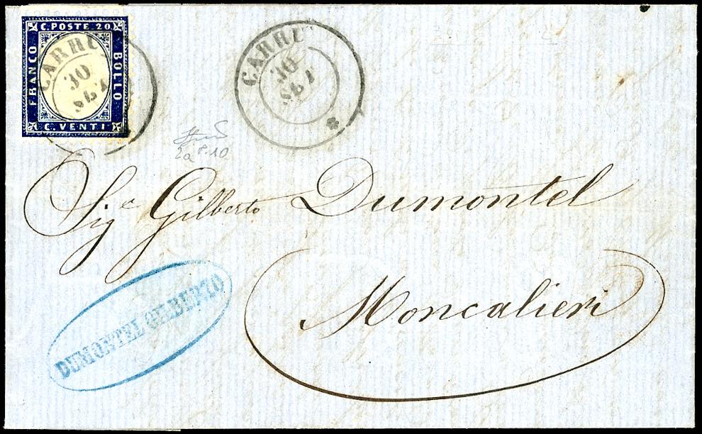 PIEMONTE-CARRU'- d.c. senza anno, punti 10 - 20 cent. (2a), perfetto, su lettera del 30/9/1862 per Moncalieri. Non comune. Ferrario.