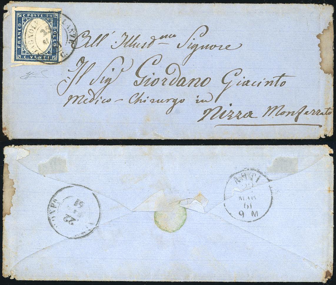 PIEMONTE-CASTAGNOLE DELLE LANZE, punti 12 - 20 cent. (15C), perfetto, su busta del 22/3/1861 per Nizza Monferrato. Non comune. Ferrario.