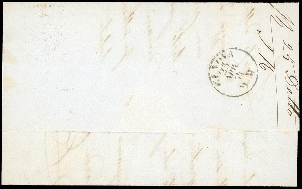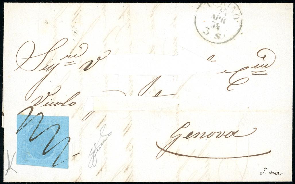 PIEMONTE-TORINO, a penna punti 13 - 20 cent. (5), bordo di foglio, intaccato in basso, su lettera del 24/4/1854 per Genova. Rarissimo annullamento sottoquotato, insieme probabilmente unico! Ferrario, cert. Bottacchi.