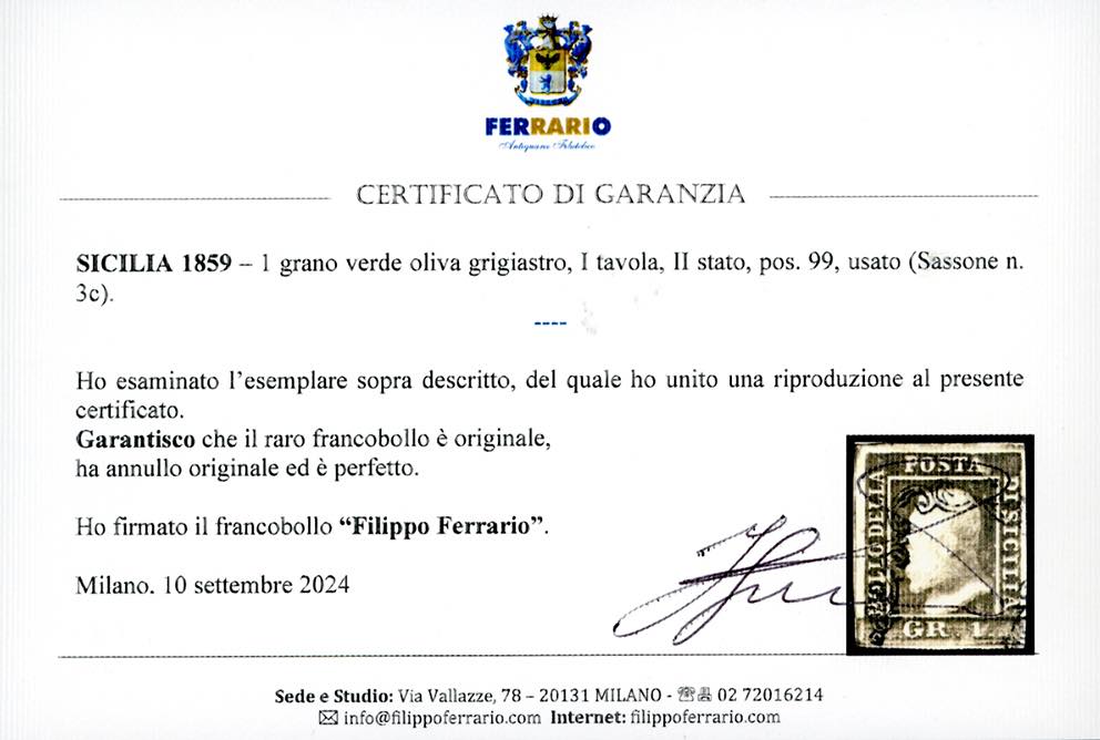 1859 - 1 grano verde oliva grigiastro, I tavola, II stato, pos. 99 (3c), usato, perfetto e molto fresco. Raro e di ottima qualità. Cert. Colla e Ferrario.