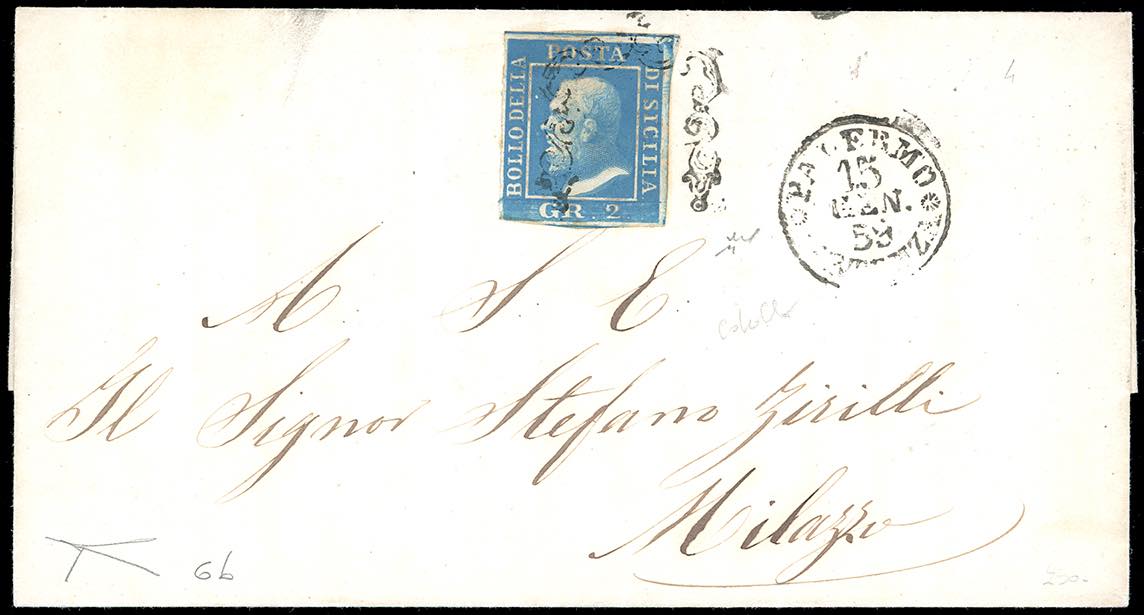 1859 - 2 grana cobalto, I tavola, carta di Napoli, tiratura antica, tendente all'oltremare, leggermente oleoso (6b/6d), perfetto, su fresca lettera da Palermo 15/1/1859, primo mese d'uso, a Milazzo. Splendida ed interessantissima tonalità di colore. Chiavarello, cert. Bottacchi. Ex coll. Imperato.