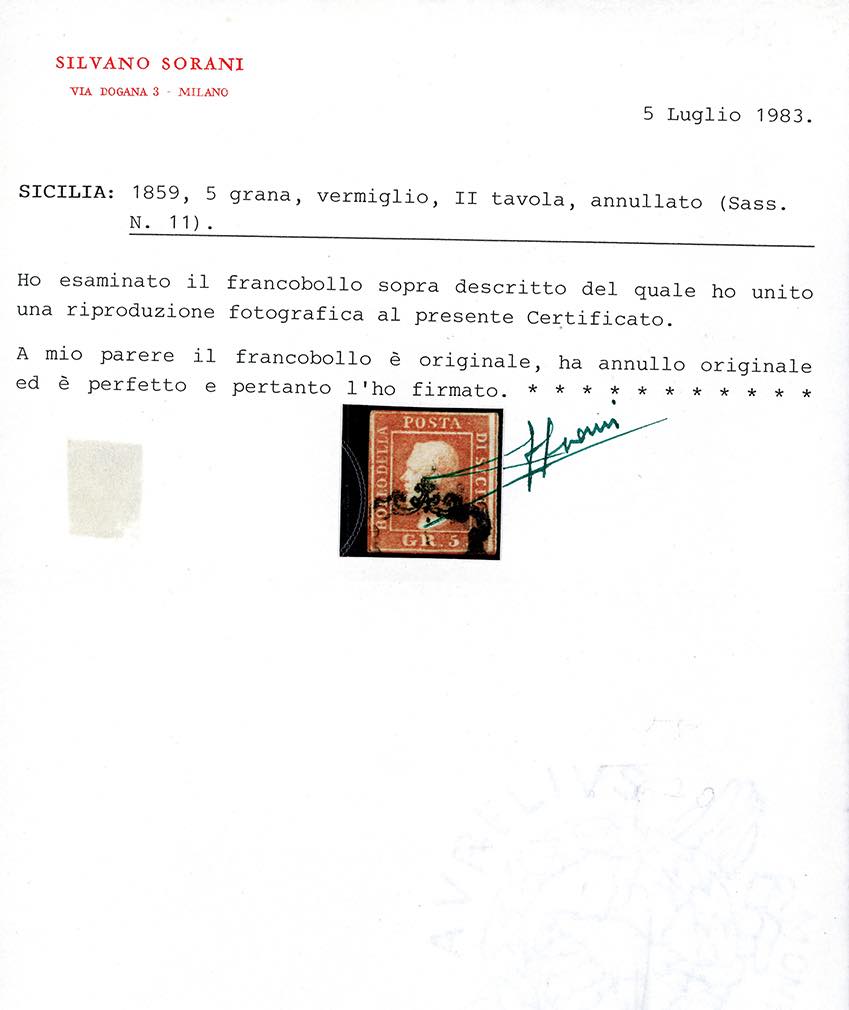 1859 - 5 grana vermiglio, II tavola (11), usato, perfetto. A.Diena, cert. Sorani.