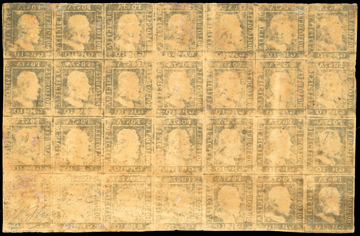 1859 - 10 grana azzurro cupo (12), blocco di 28 esemplari, testa d'avorio al verso, ottimo stato, eccezionale freschezza, gomma originale, integra per nove esemplari. Molto raro, da esposizione. G.Oliva, E.Diena, Raybaudi, cert. Ferrario.