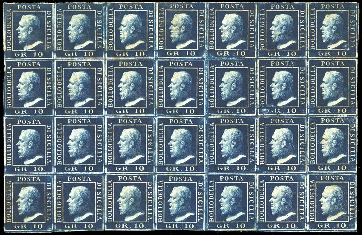 Lotto 907 - 1859 - 10 grana azzurro cupo (12), blocco di 28 esemplari, ...