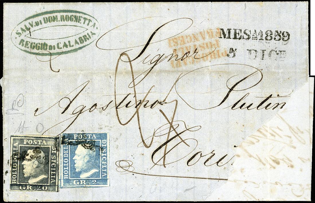 1859 - 20 grana grigio ardesia, 2 grana azzurro, I tavola (13,6), perfetti, su sovracoperta di lettera, parzialmente incompleta, da Messina 5/12/1859 a Torino, con i Piroscafi postali francesi, tassata. A.Diena, cert. Sirotti.