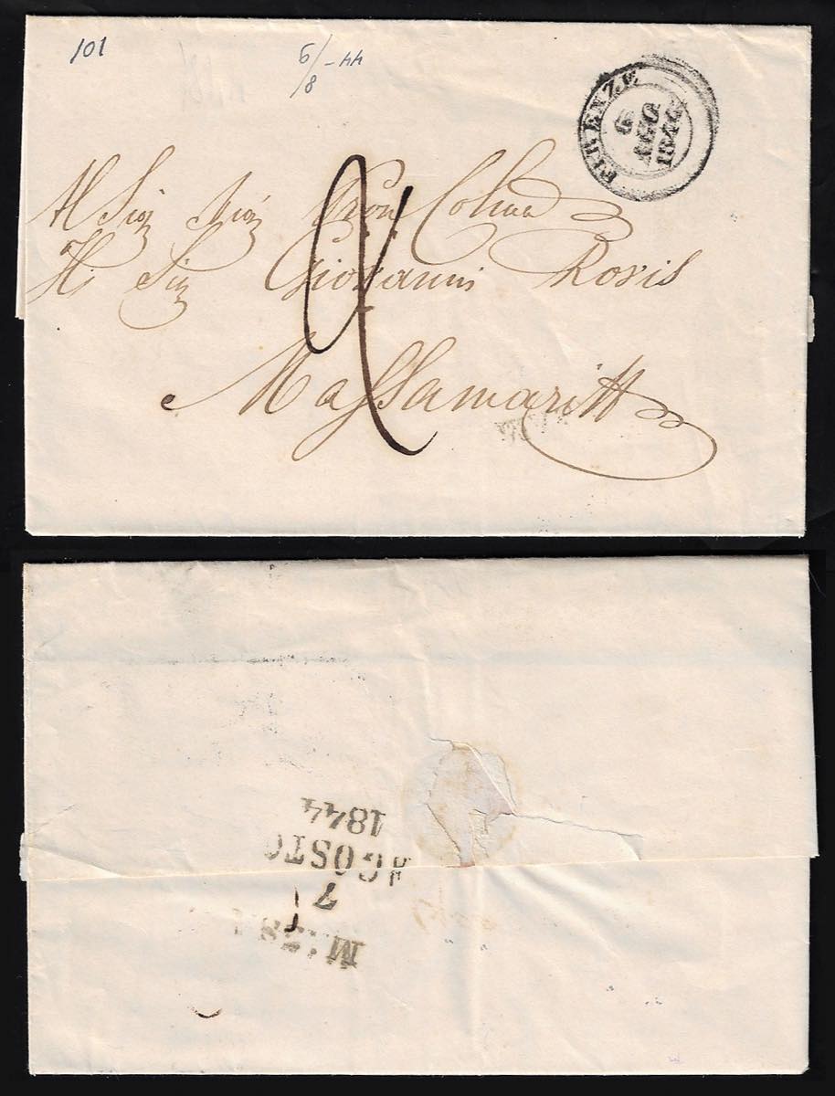 1844 - Lettera prefilatelica da Firenze 6/8/1844 a Massa Marittima, tassata 2 crazie, con al verso il datario su quattro righe (Aspot 3). Bella.