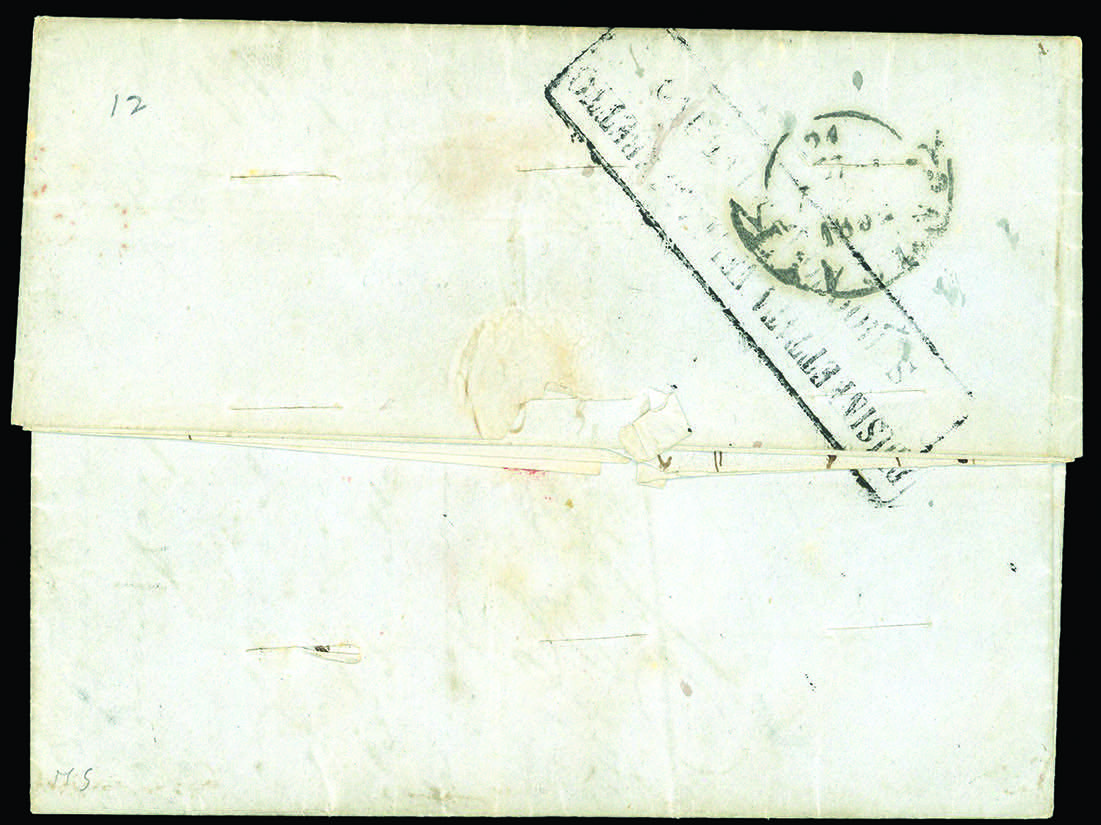 INCOMING MAIL TUNISIA 1852 - Lettera non affrancata da Tunisi 23/3/1852 a Livorno, tassata, sul fronte bollo ovale rosso V.P.M. La lettera venne disinfettata attraverso 9 tagli di disinfezione, con bollo del Lazzaretto di San Rocco al verso. Ex coll. Imperato.
