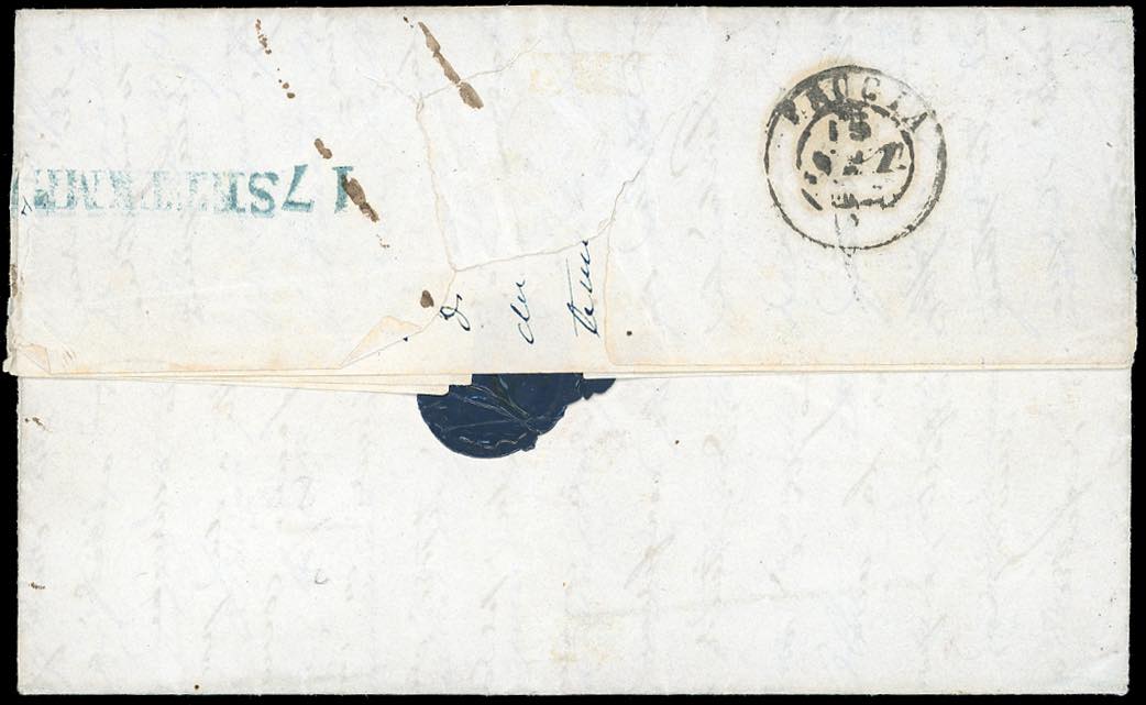 1852 - 2 soldi scarlatto, due esemplari, 1 soldo giallo limone, tutti su carta azzurra (3,2a), francobollo da 1 soldo perfetto, gli altri con un margine leggermente intaccato, su fresca lettera da Pisa 11/9/1852 ad Osimo, tassata 8 baj. Rara. Cert. A.Diena.