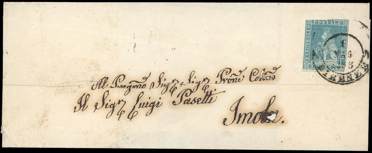 1855 - 2 crazie azzurro verdastro su grigio (5e), difetti di marginatura, su sovracoperta di lettera da Firenze 1/5/1855 a Imola. Pregevole tariffa limitrofa per lo Stato Pontificio.