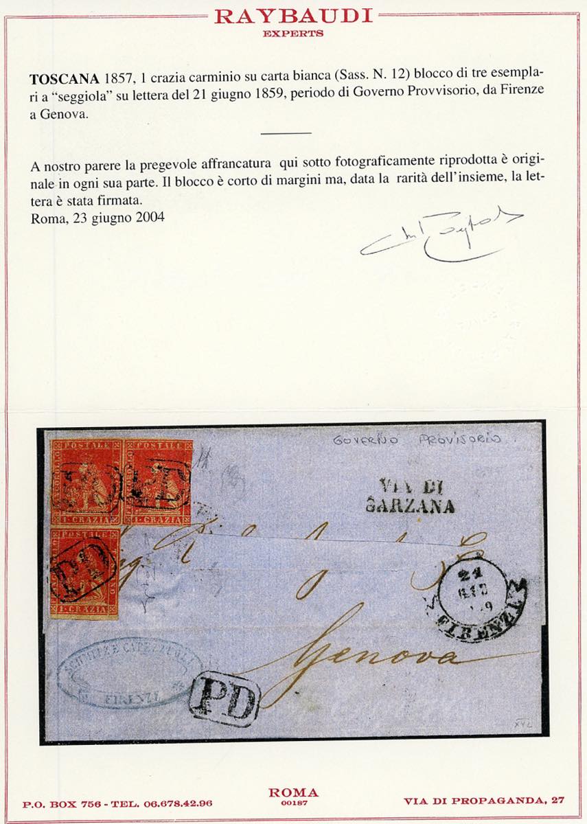 1859 - 1 crazia carminio (12), striscia di tre a seggiola, due francobolli con un margine verticale intaccato, su lettera da Firenze 21/6/1859 a Genova, in PD. Rara affrancatura in periodo di Governo Provvisorio. Em. e A.Diena, cert. Raybaudi.