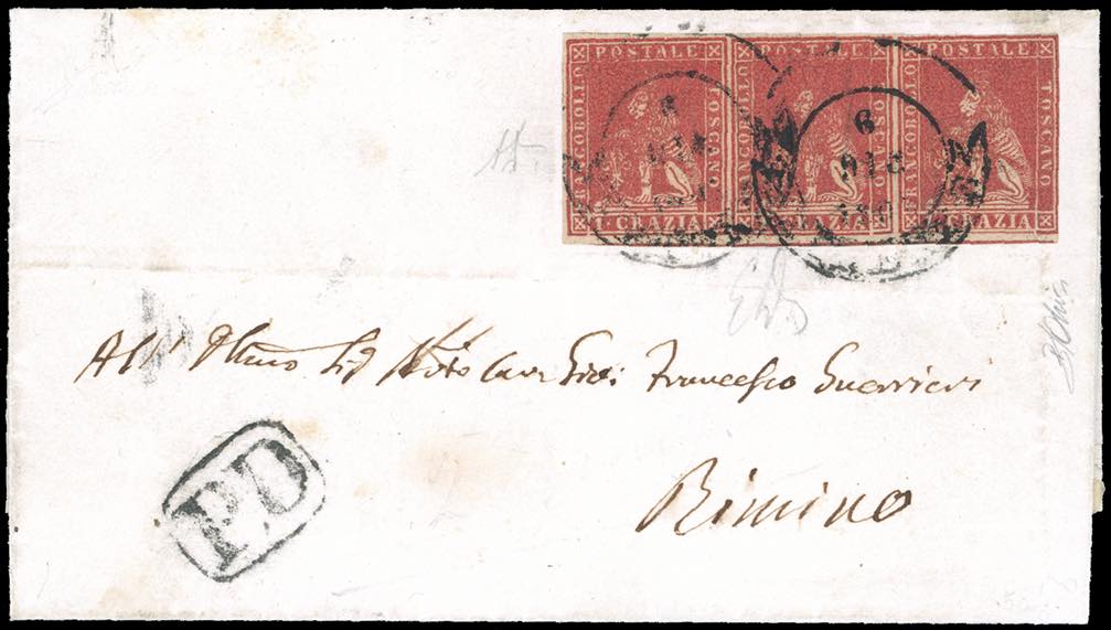 1859 - 1 crazia carminio, II emissione (12), striscia orizzontale di tre, appena sfiorata a sinistra, su lettera da Firenze 6/12/1859 a Rimini, durante il Governo Provvisorio. Non comune. Emilio e Alberto Diena, cert. Oliva.