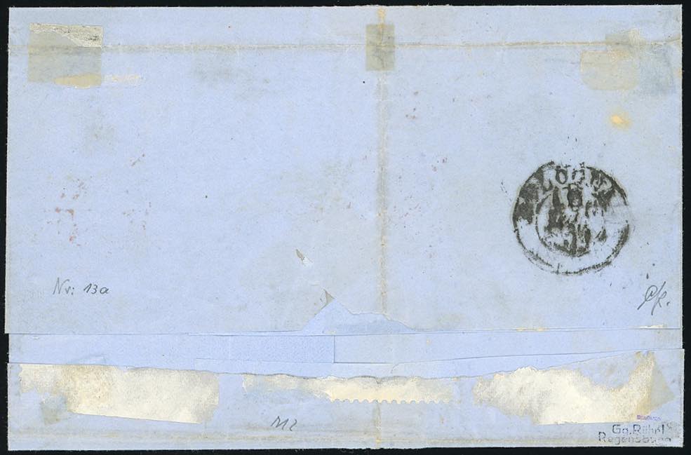 1859 - 2 crazie azzurro, II emissione (13), coppia orizzontale, tre margini eccezionali, giusta a destra, su sovracoperta di lettera da ... Leggi tutto