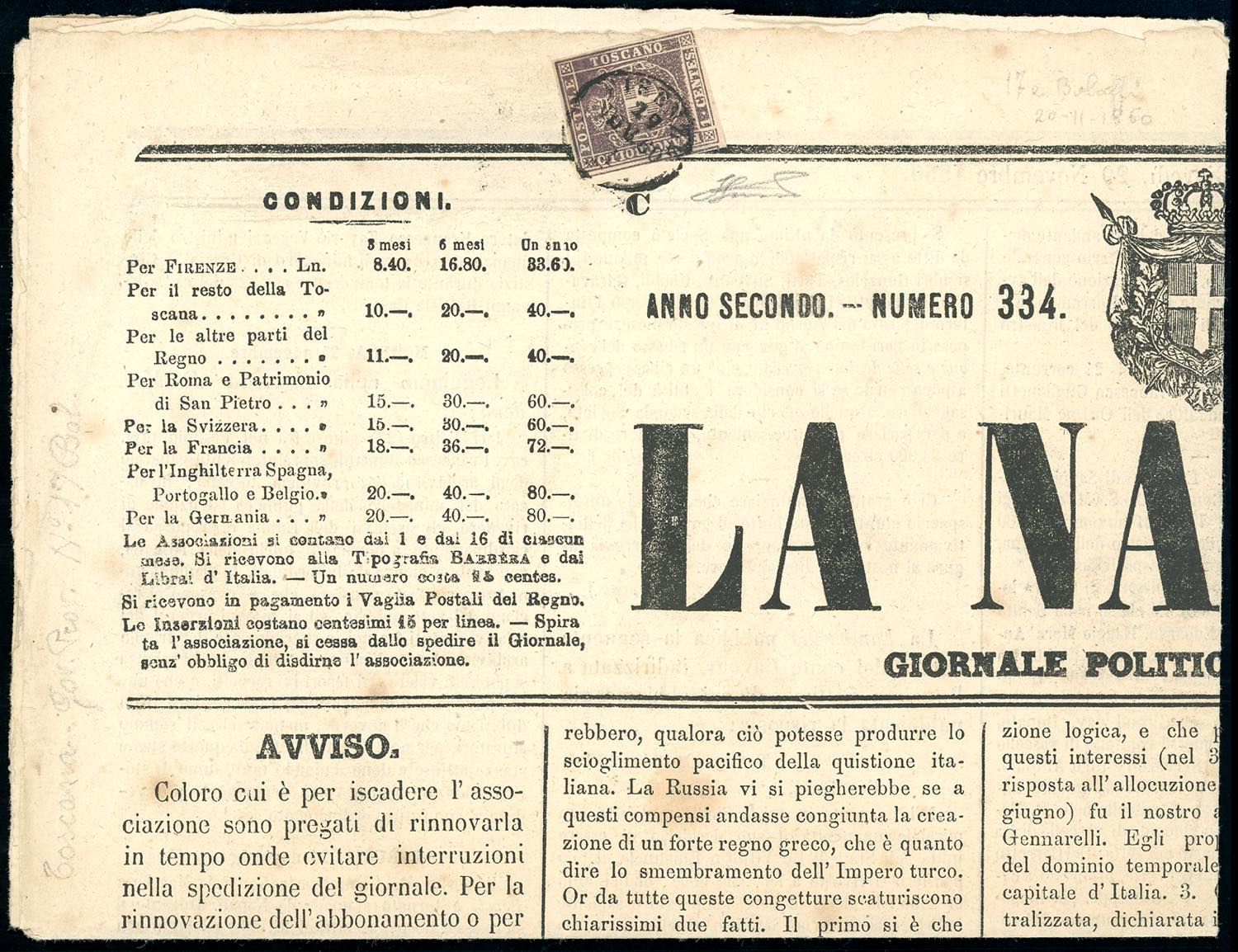 1860 - 1 cent. violetto bruno (17), perfetto e ben marginato, isolato su giornale "La Nazione" usato a Firenze 29/11/1860. Bello! Cert. Ferrario.
