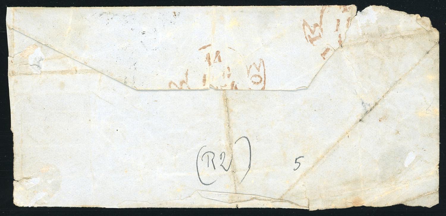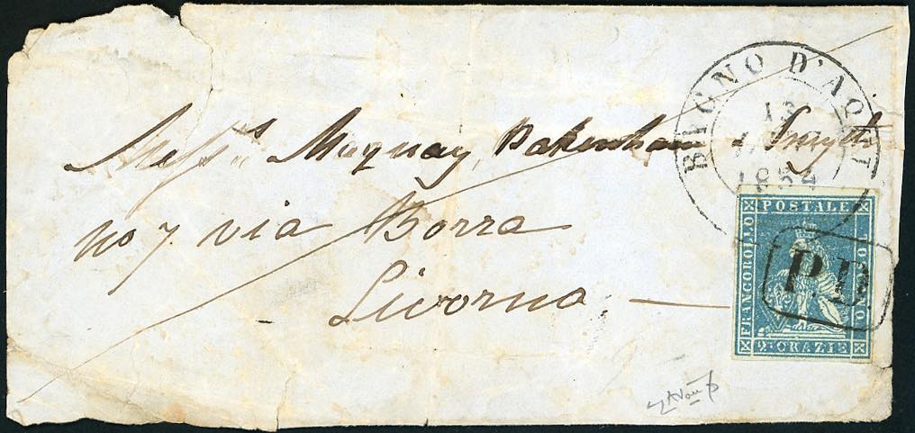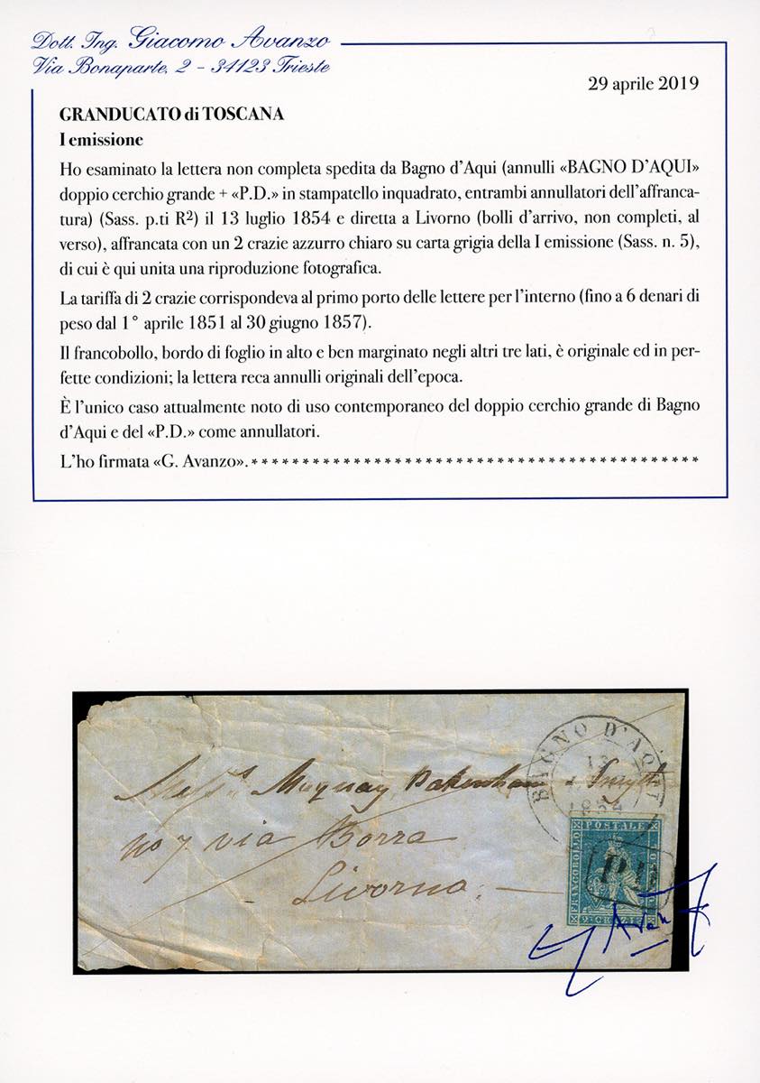 BAGNO D'AQUI, doppio cerchio grande + PD coannullatori punti R2 (Sassone 2020) - 2 crazie (5), bordo di foglio in alto, perfetto, su frontespizio di lettera con parte del verso del 13/7/1854 per Livorno, con bollo d'arrivo. Insieme unico, molto rara! Cert. Avanzo.