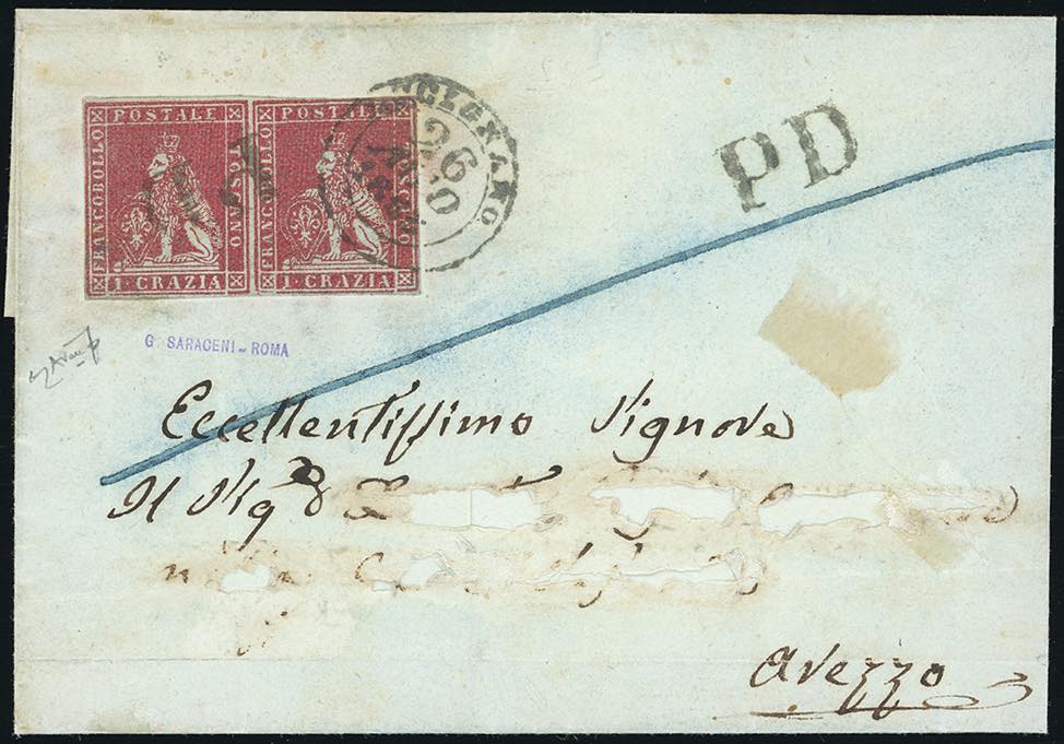 LUCIGNANO, doppio cerchio piccolo + PD coannullatori punti 10 - 1 crazia (4d), coppia, margini giusti, su sovracoperta di lettera, indirizzo in parte asportato, del 26/8/1853 ad Arezzo. Combinazione di annulli ad oggi inedita! Cert. Avanzo.