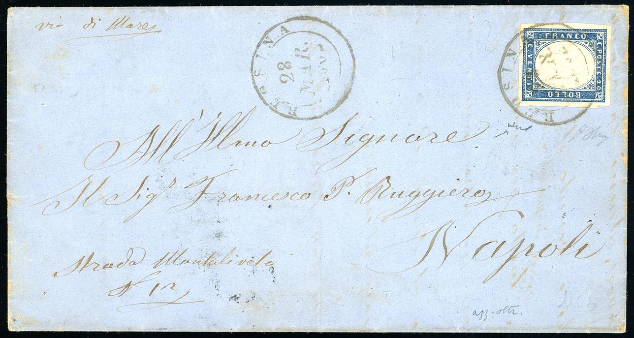 RUOSINA, punti 11 - 20 cent. azzurro oltremare IV emissione di Sardegna (15Dc), perfetto, su lettera del 28/3/1862 a Napoli, al verso numerosi bolli del complesso tragitto per arrivare a Livorno, dove ha preso la via di mare. Interessante e pregevole annullamento. G.Oliva, Chiavarello. Ex coll. Imperato.