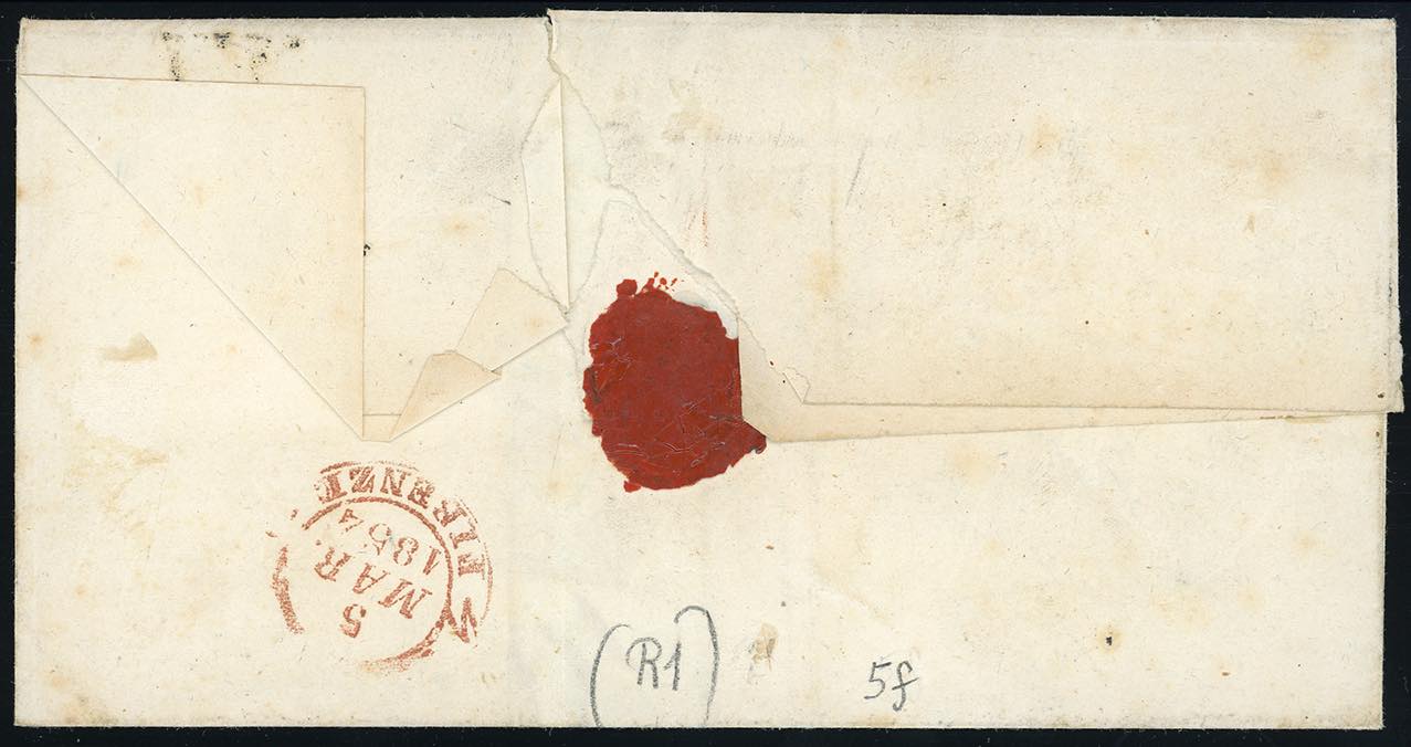 TALAMONE, doppio cerchio medio + PD coannullatori punti R1 - 2 crazie (5f), due margini leggermente sfiorati, su sovracoperta di lettera del 4/3/1854 per Firenze. Combinazione di annulli ad oggi inedita, unica nota! Cert. Avanzo.
