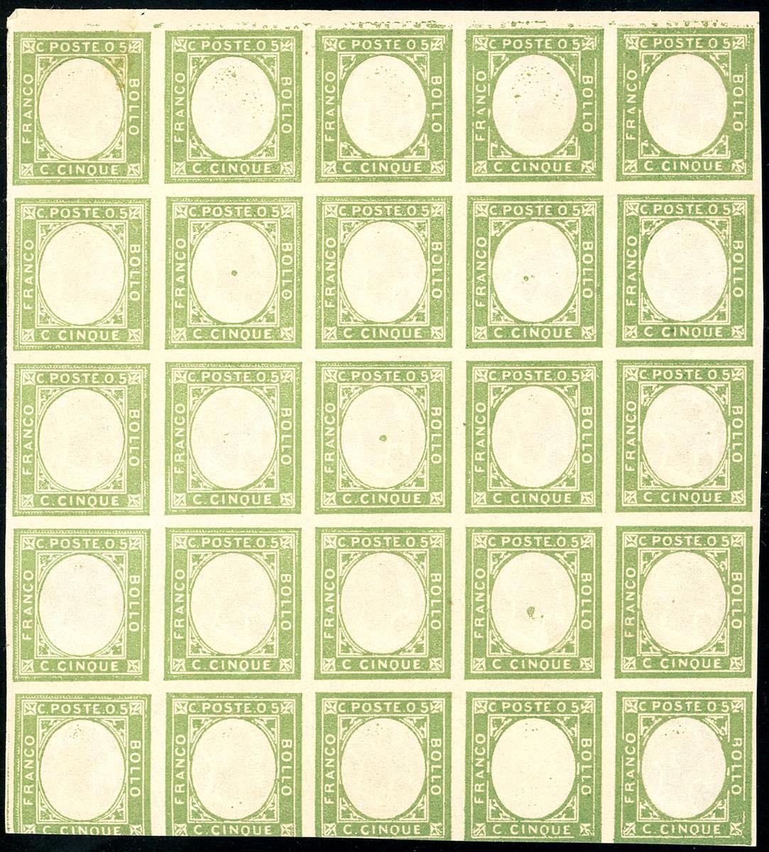 1861 - 5 cent. verde giallo, non emesso, blocco di venticinque esemplari, uno senza effigie (1e), gomma originale, integra per gli esemplari centrali, margine inferiore corto. A.Diena, Ferrario. Ex collez. Imperato.