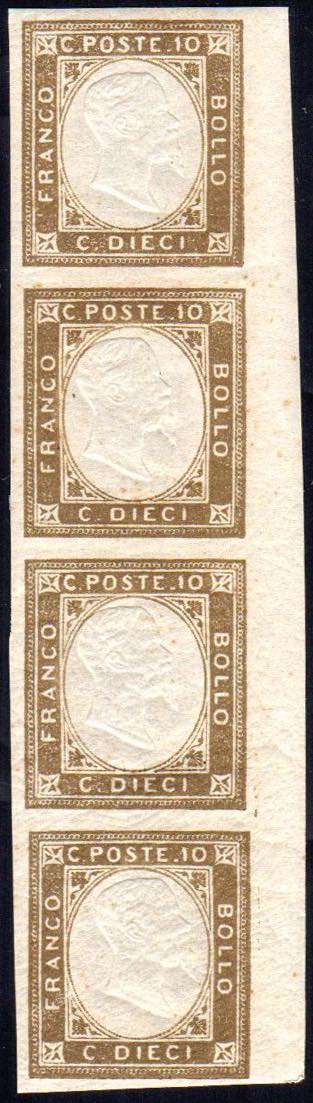 1861 - 10 cent. terra d'ombra, non emesso, striscia verticale di quattro con margine destro di foglio non tosato (2), gomma integra, ... Leggi tutto