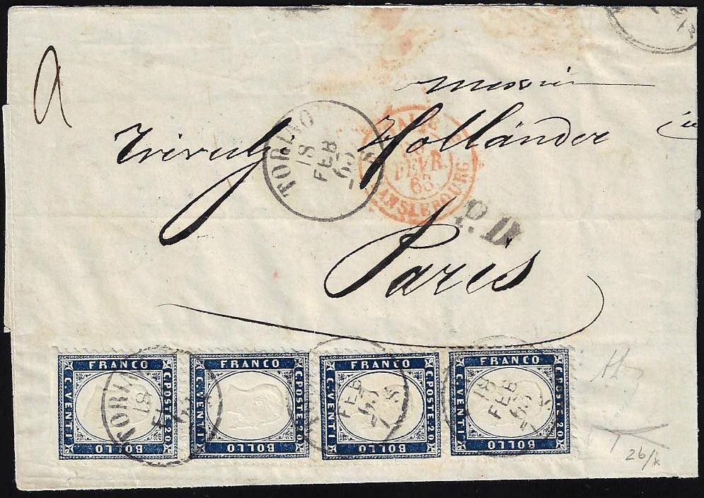 1863 - 20 cent. indaco chiaro, due coppie verticali, una non dentellata in basso (2b,2b/k), perfette, su sovracoperta di lettera da Torino 18/2/1863 a Parigi, in tariffa di doppio porto. Raro insieme, anche per l'uso nel 1863. A.Diena, cert. Bottacchi. (cat. Sassone € 60.000+ in proporzione).