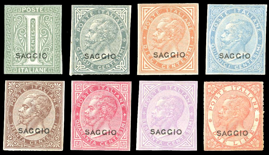1863 - De La Rue, 8 valori soprastampati "saggio", provenienti dal foglietto Menabrea (L14,L16/L22), ritagliati lungo la cornice, gomma originale, perfetti.