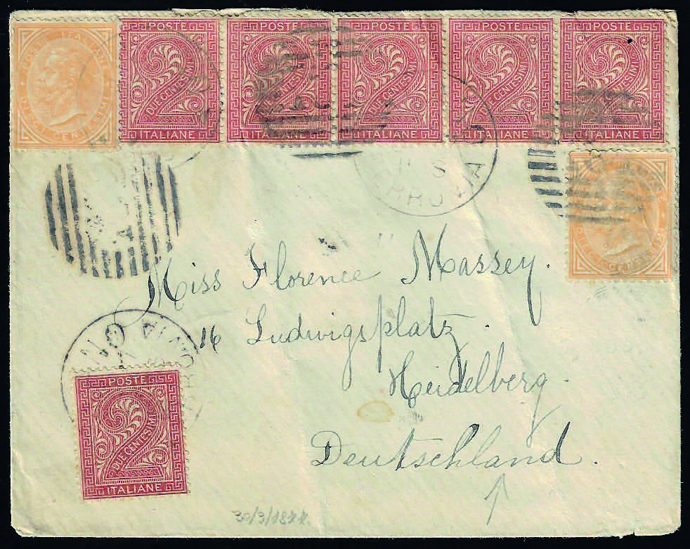 1877 - 2 cent., sei esemplari, 10 cent. De La Rue, tiratura di Torino (T15,T17), lievi difetti, su busta da Milano 30/3/1877 per la Germania. Rara affrancatura multipla per l'estero.