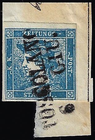 1854 - 3 cent. Mercurio azzurro, II tipo (2), perfetto, usato su frammento a Toscolano 6/6. Ferrario.