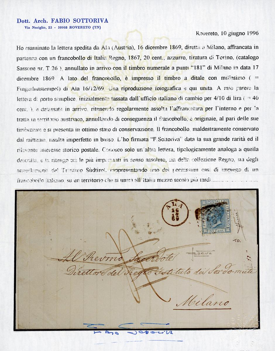 1869 - 20 cent. azzurro, tiratura di Torino (T26), difetti, su lettera da Ala 16/12/1869 a Milano, annullato in arrivo, tassata e detassata. Eccezionale documento spedito già affrancato con francobollo italiano dal Tirolo ancora austriaco e affrancatura ritenuta valida in Italia. Rarità. Cert. Sorani e Sottoriva.
