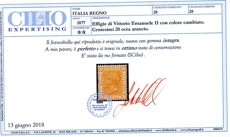 1877 - 20 cent. ocra arancio (28), nuovo, gomma originale integra, perfetto e molto fresco. Buona centratura. Cert. Cilio.