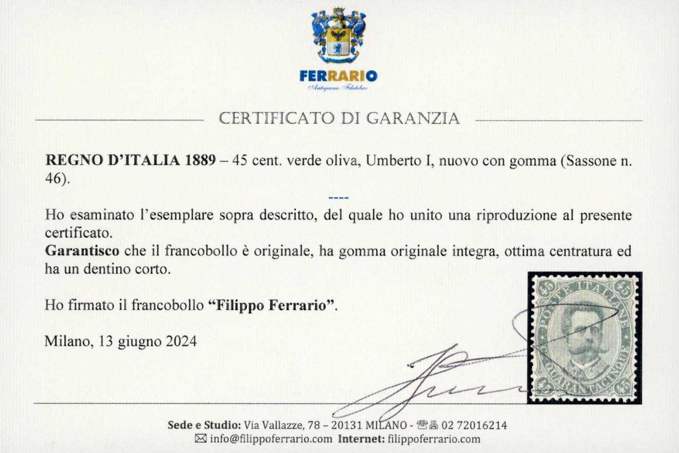 1889 - 45 cent. Umberto I (46), centratura eccezionale, gomma originale integra, un dentino corto, ottimo aspetto. Raro. Cert. Ferrario.