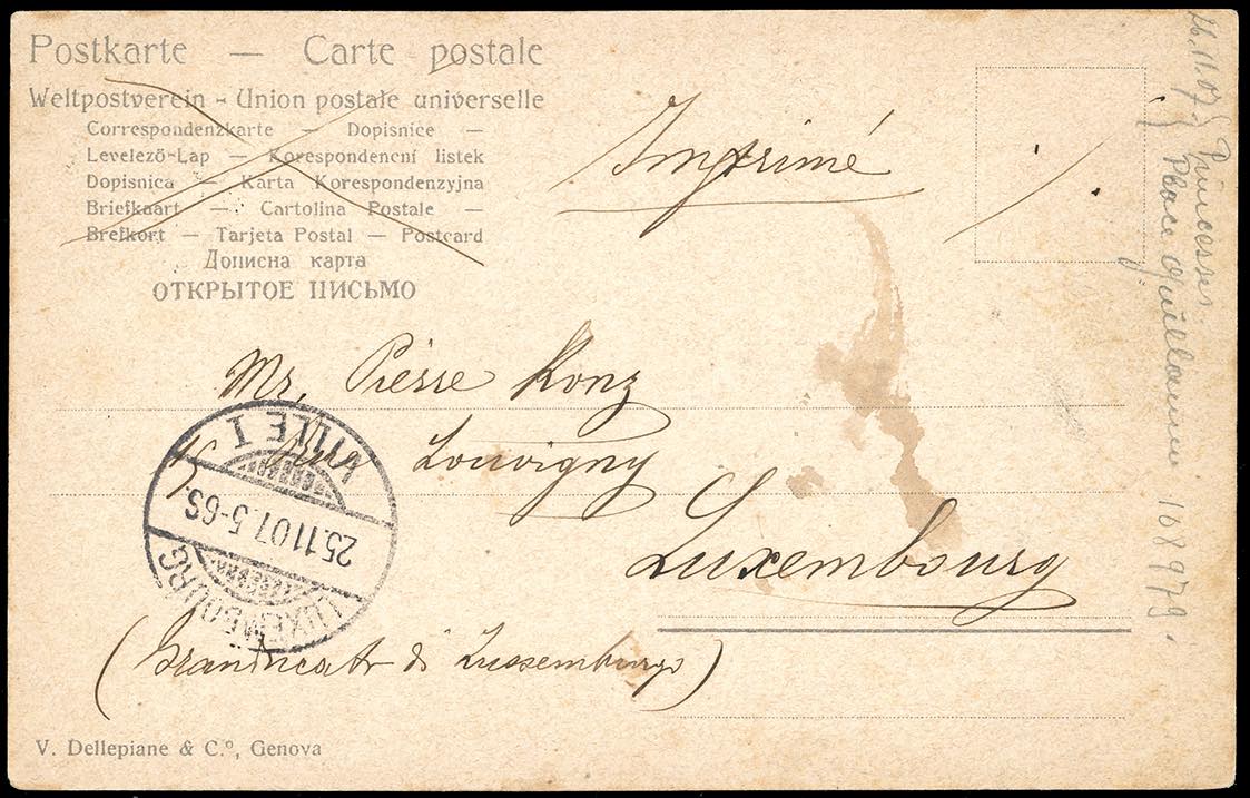 1907 - 5 cent. Leoni (81), perfetto, isolato su cartolina da Genova 24/11/1907 spedita in Lussemburgo, bollo d'arrivo. Destinazione del ... Leggi tutto