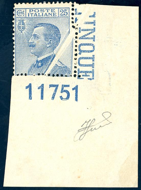 1908 - 25 cent. Michetti, pli d'accordeon precedente alla stampa, francobollo di formato irregolare (83), angolo di foglio inferiore destro con numero di tavola 11751, nuovo, gomma originale integra, perfetto. Insieme molto bello ed unico. Ferrario.