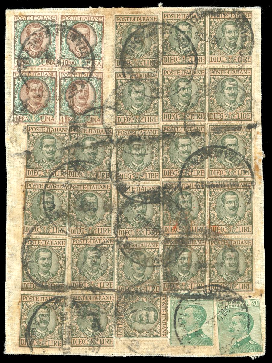 1925 - 10 lire Floreale, ventiquattro esemplari, 1 lira Floreale, quattro esemplari, 20 cent. Michetti, due esemplari (91,77,184), usati su frammento di busta telata a Roma 30/7/1925. Eccezionale affrancatura multipla e la MASSIMA NOTA del 10 lire Floreale. Rarità del settore. Cert. Ferrario.