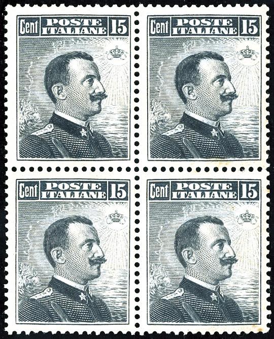 1911 - 15 cent. Michetti, III tipo (96), ottima centratura, blocco di 4, gomma originale integra, perfetto. Ferrario.