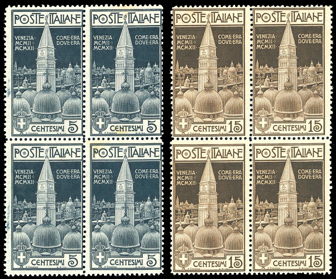 1912 - Campanile di Venezia, serie completa (97/98), blocchi di quattro, gomma originale integra, perfetti, freschi. Ferrario.