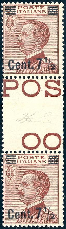 1927 - 7 1/2 su 85 cent. Michetti, soprastampa del II tipo, coppia verticale con interspazio di gruppo al centro (136), nuova, gomma ... Leggi tutto
