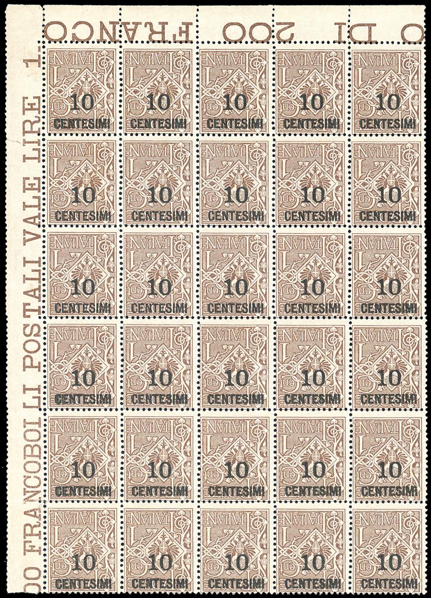 1923 - 10 cent. su 1 cent., soprastampa capovolta (137a), blocco di 30 esemplari, angolo di foglio, gomma originale integra, perfetto.