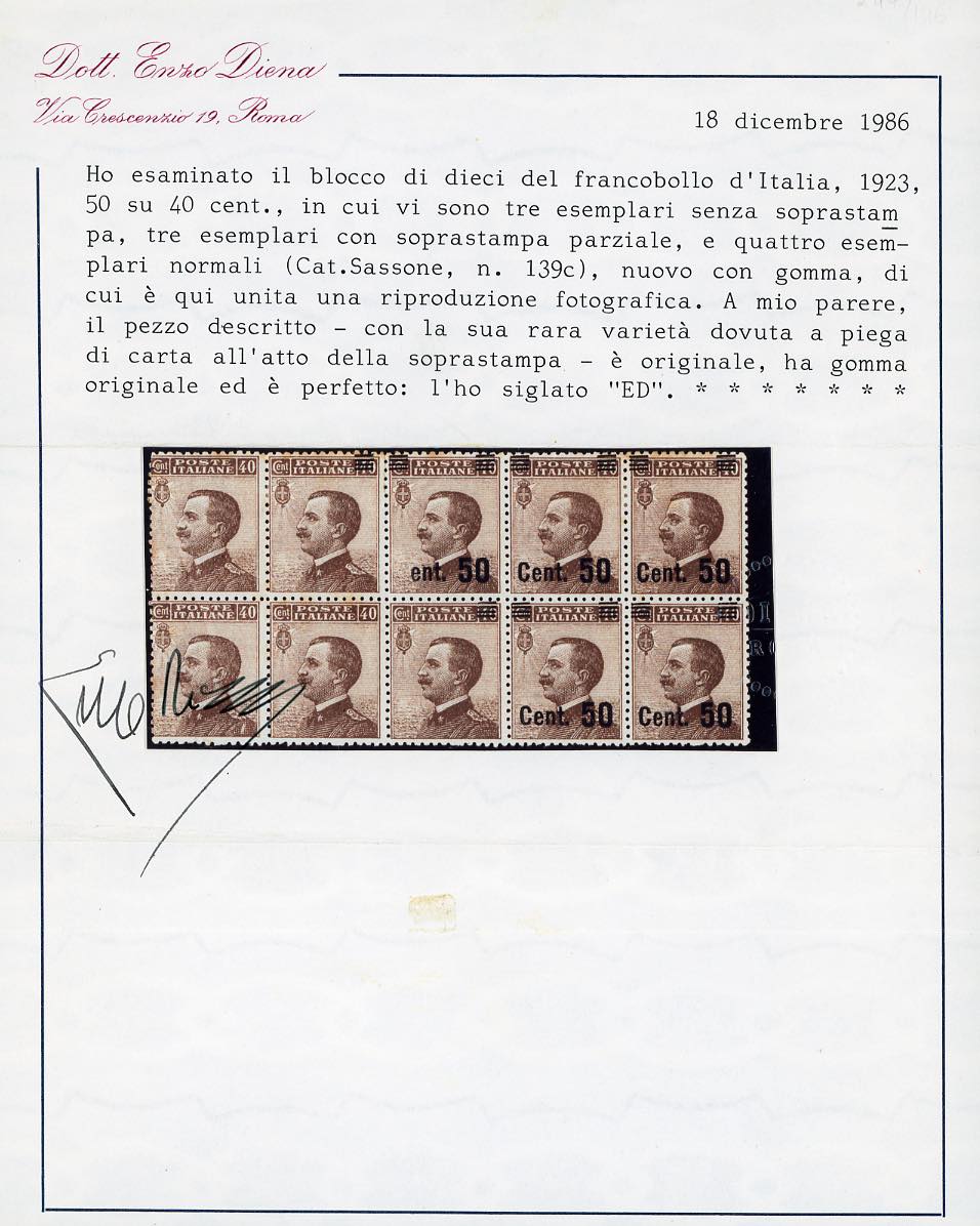 1923 - 50 su 40 cent. Michetti (139), blocco di dieci esemplari, due con soprastampa parziale solo al verso, uno totalmente privo, uno con solo sbarrette, uno senza C di CENT. ed uno in coppia con e senza stampa, gomma originale, integra per alcuni esemplari, lievi ossidazioni. Insieme rarissimo! Cert. Diena.