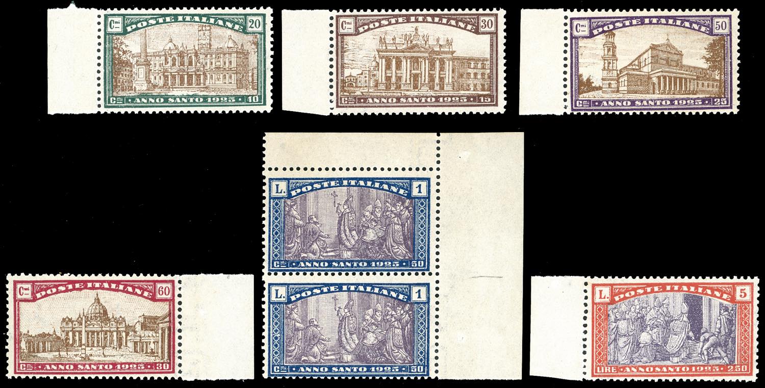 1924 - Anno Santo, serie completa con filigrana lettere (169/174), bordo di foglio, nuovi, gomma originale integra, perfetti. Molto belli e rari. Sei cert. Diena.