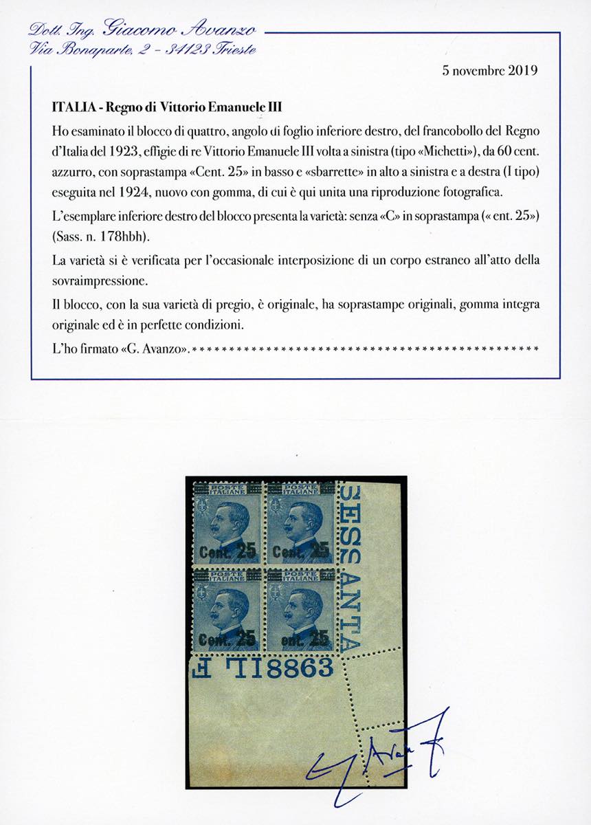 1924 - 25 cent. su 60 cent., soprastampa del I tipo, blocco di quattro, un esemplare senza "C" in soprastampa (178hbh), angolo di foglio, gomma originale integra, perfetto. INSIEME UNICO, generato dall'occasionale interposizione di un corpo estraneo all'atto della soprastampa. Ferrario, cert. Avanzo.