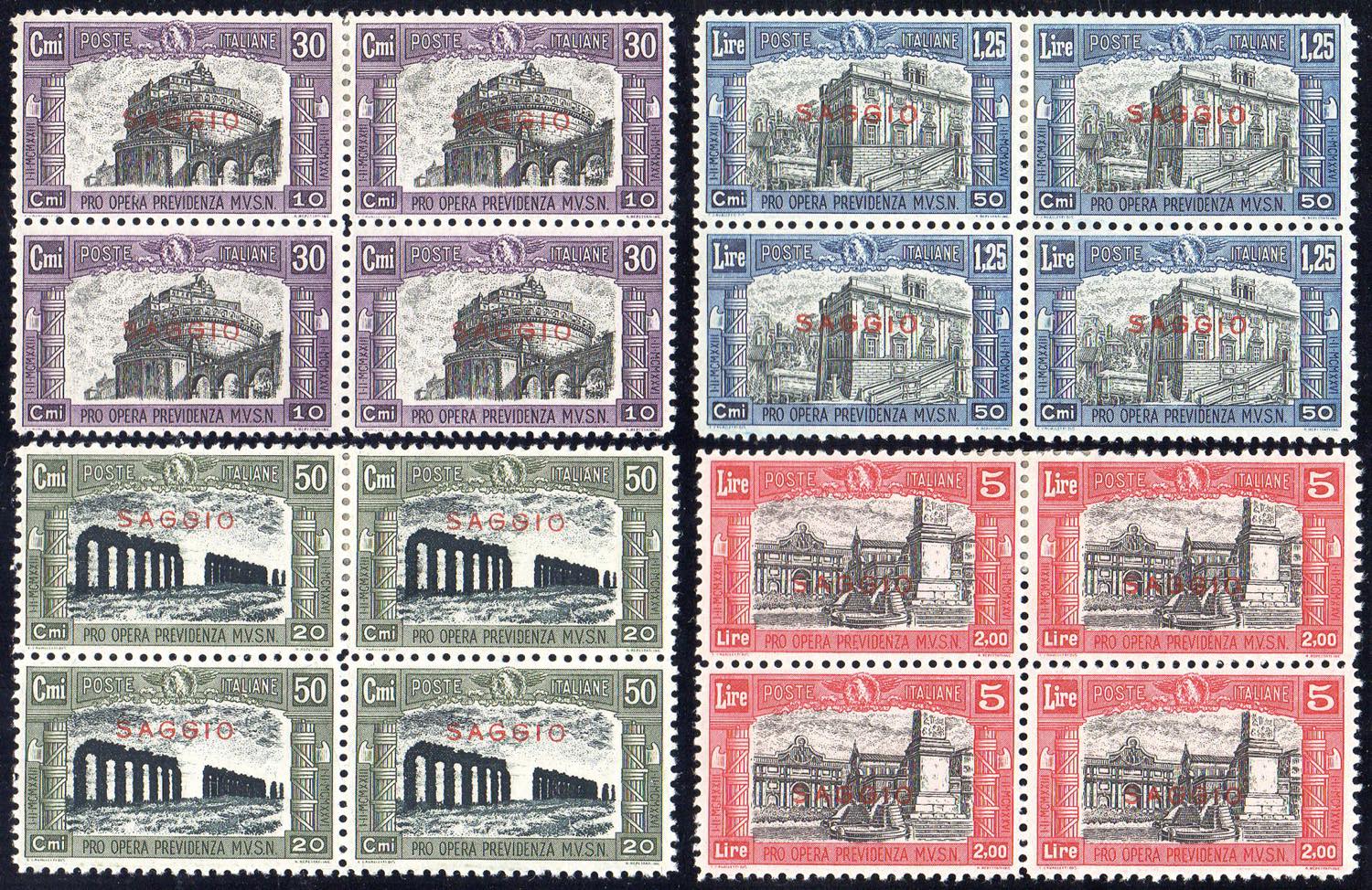 1928 - Milizia II, soprastampati "saggio" (220/223), blocchi di quattro, senza gomma, perfetti.